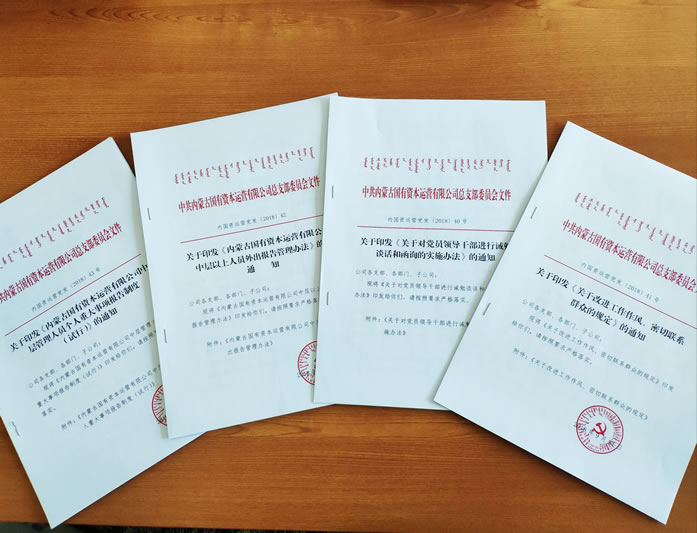 公司党总支以公司改组发展制度体系建设为契机,加强党建制度建设,在年初的党建工作座谈会上对党建制度建设作出了规划并列出了清单,结合公司改组发展实际情况,把《内蒙古国有资本运营有限公司中层以上人员外出报告管理办法(试行)》《内蒙古国有资本运营有限公司中层管理人员个人重大事项报告制度(试行)》《关于对党员领导干部进行诫勉谈话和函询的实施办法(试行)》《关于改进工作作风、密切联系群众的规定(试行)》四项制度作为首批党建制度建设的重点内容。通过参阅党内相关规定、借鉴国资委系统内企业经验、向上级纪检组织学习咨询、制度体系建设小组讨论、公司党总支会审核把关等程序,经过多次修改,四项制度于10月份正式印发实施。